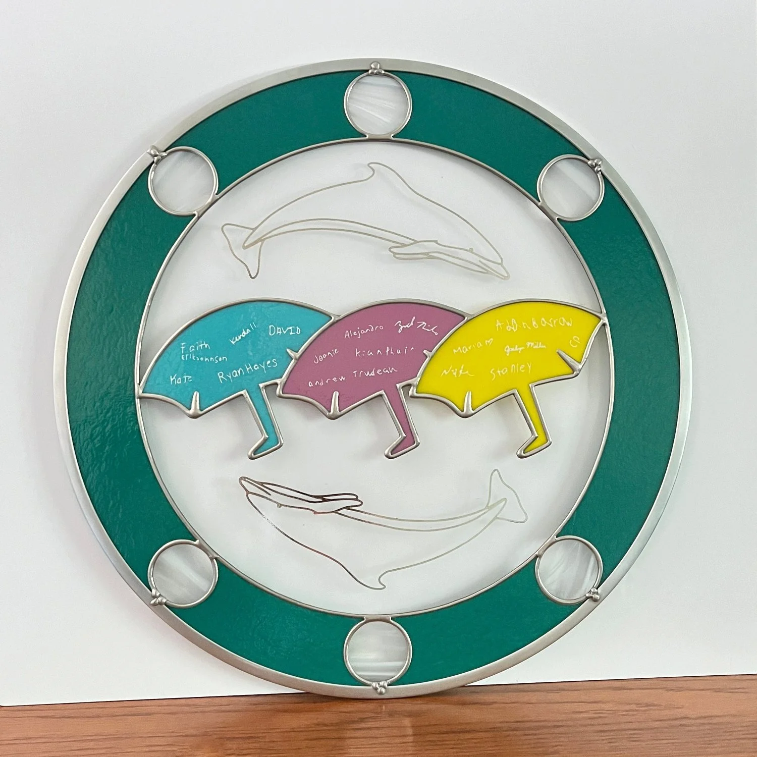 For her South Padre Island ode, Jaclyn pulled from several memorable elements of her trip: the border of the piece is a nod to the teal and white beach house she and her bandmates shared during their stay, while the center umbrellas in blue, pink and yellow capture the SPI logo that was painted along the sidewalks she traversed daily with her new friends. Poured silver dolphins jump over and under the umbrellas, inspired by the beautiful wild dolphins the band saw together on an eco boat tour around the island, and the umbrellas have the names of each traveler (in their own handwriting) painted onto them, borrowed from the keepsake poster everyone signed on the last day of the trip. Jaclyn’s ode is made of just 17 pieces of cut and ground glass, to represent the 17 travelers on the South Padre Island trip.